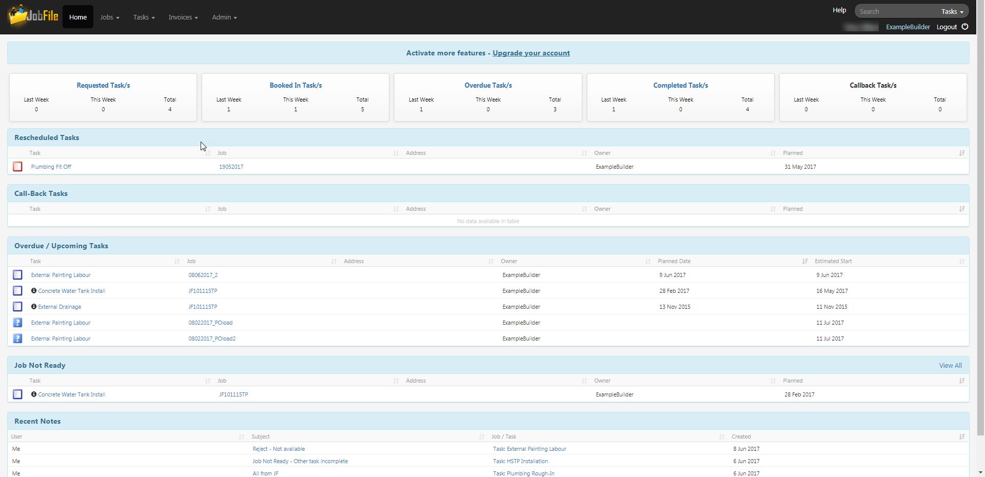 - There is a job not ready tasks section which highlights your tasks that you have recorded as not ready.