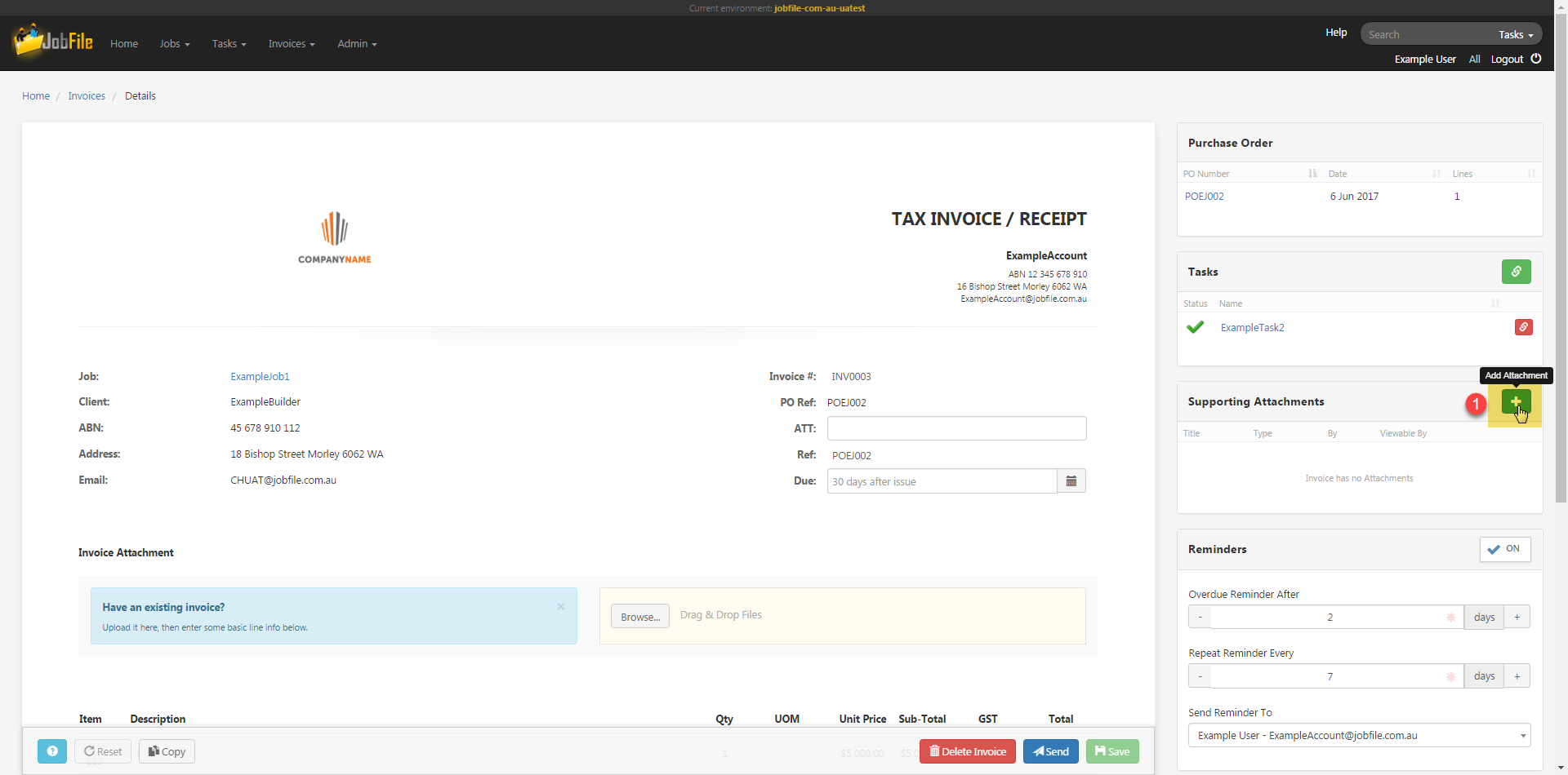 - Go to an invoice in DRAFT status and in the right hand side bar click on 'Add attachment' in the Supporting Attachments section